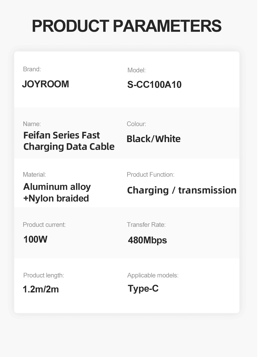 - An tâm sử dụng: Với chip E-Marker, bạn có thể hoàn toàn yên tâm khi sử dụng dây sạc Joyroom CC100A10 cho các thiết bị của mình, kể cả các thiết bị Samsung cao cấp.