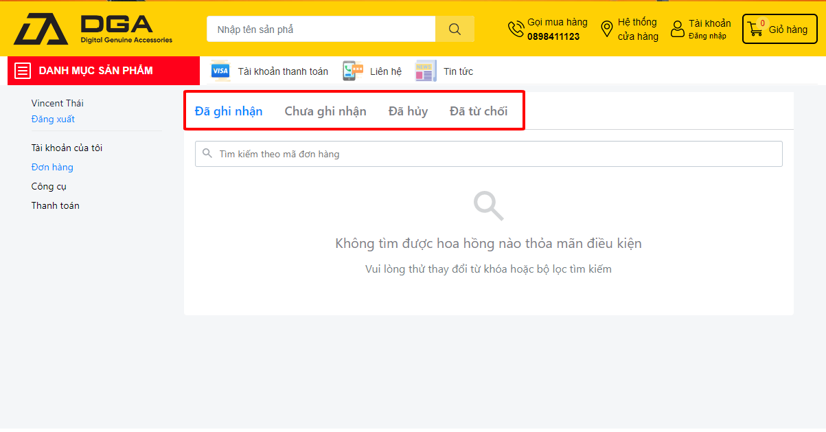 Ở trang đơn hàng, chúng ta dễ dàng thấy được các đơn hàng đã được Ghi nhận - Chưa ghi nhận - Đã hủy - Từ Chối
