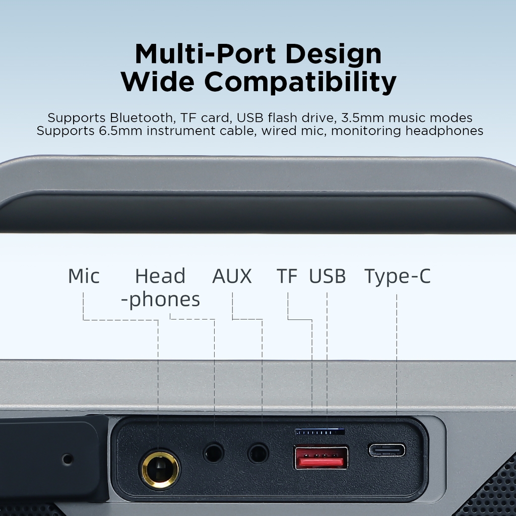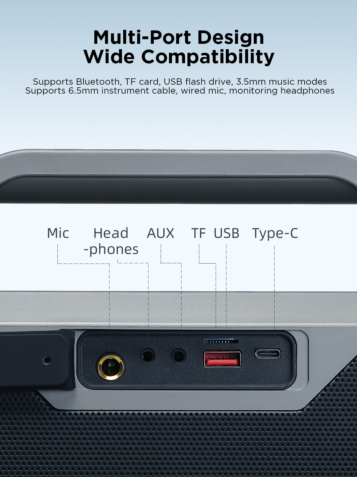 Supported mic mode: UHF wireless mic*2, 6.5mm wired mic