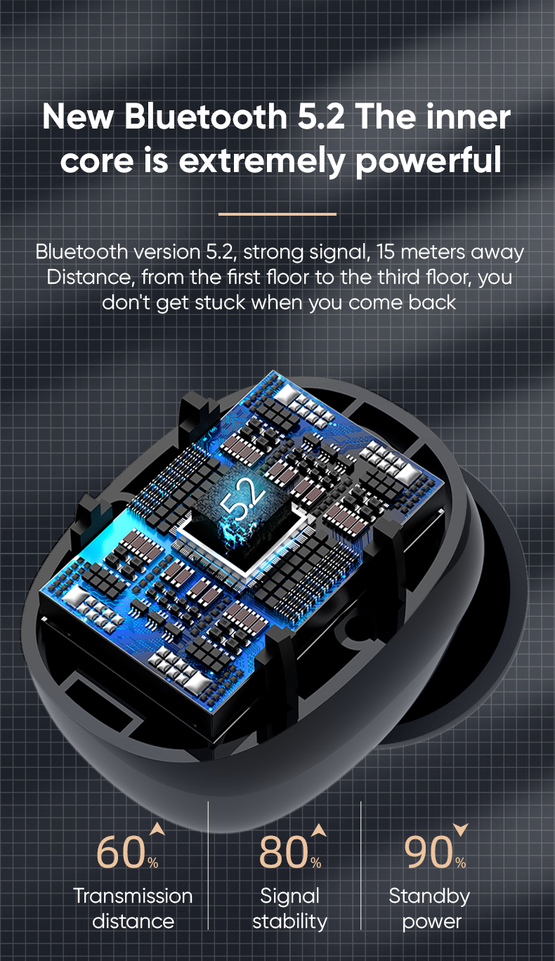 [BT 5.2, tiêu thụ điện năng thấp, kết nối nhanh]: Chip BT 5.2, hiệu suất ổn định, tiêu thụ điện năng cực thấp, kết nối tức thì không bị lag. Đường truyền nâng cao & kết nối đáng tin cậy giúp tín hiệu âm thanh ổn định hơn.