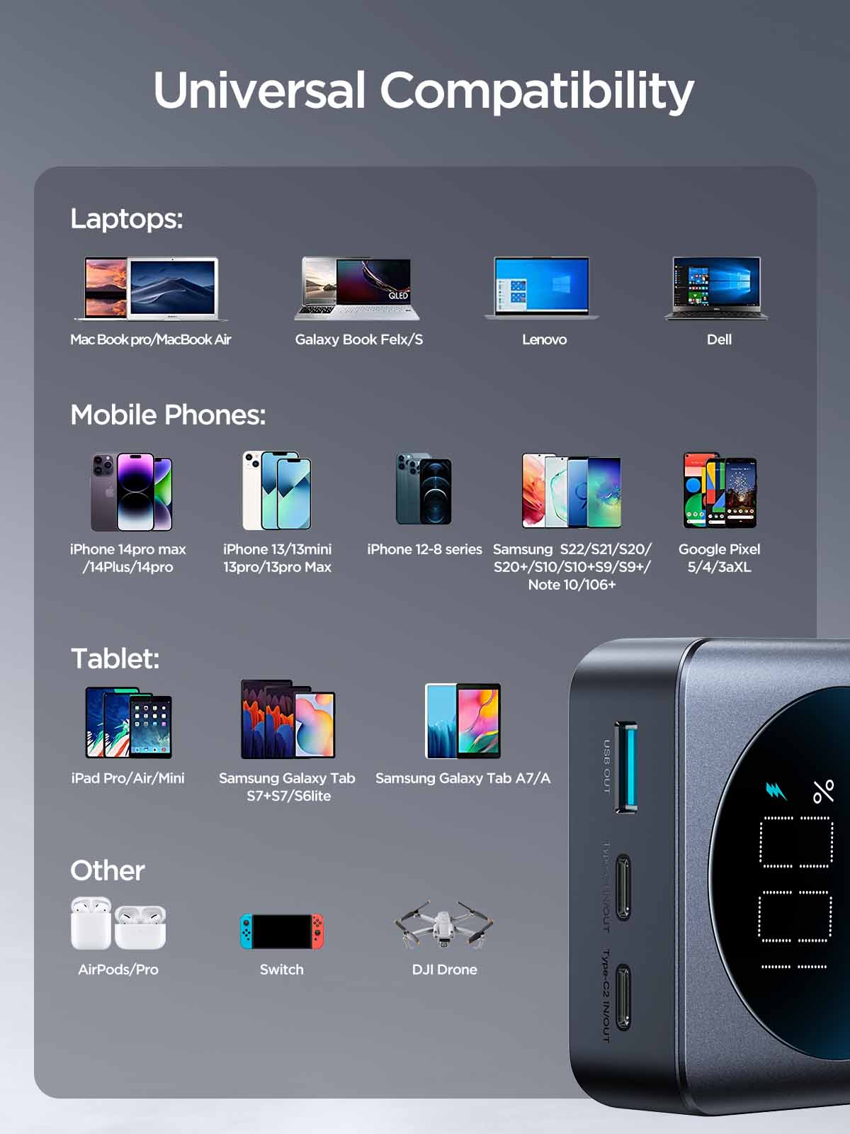 Sạc dự phòng 65w này đi kèm với một cáp USB đa năng, cho phép bạn kết nối được với nhiều loại thiết bị khác nhau. Bạn có thể sạc cùng lúc điện thoại di động, máy tính bảng và cả Laptop chỉ với một sản phẩm duy nhất.