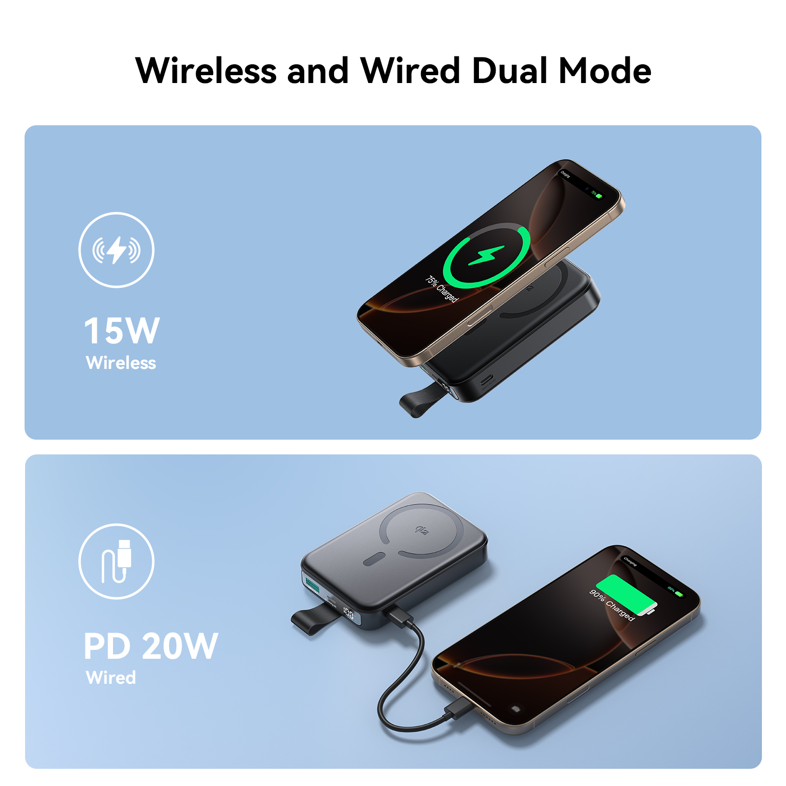 - Kết nối nhanh chóng: Nam châm tích hợp giúp điện thoại và sạc dự phòng tự động kết nối, không cần phải cắm dây.