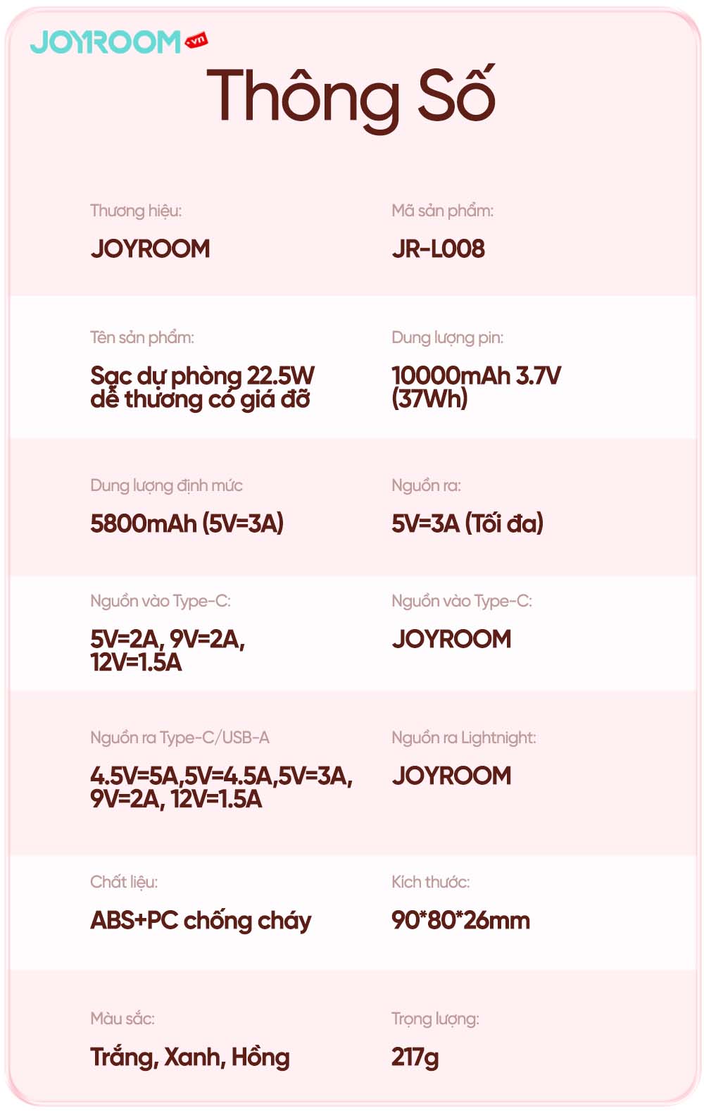Tóm lại, Sạc dự phòng Joyroom Jelly Series 22.5W Power Bank 10000mAh là một sản phẩm sạc dự phòng tiện lợi, đa năng và an toàn, phù hợp cho nhiều người sử dụng.