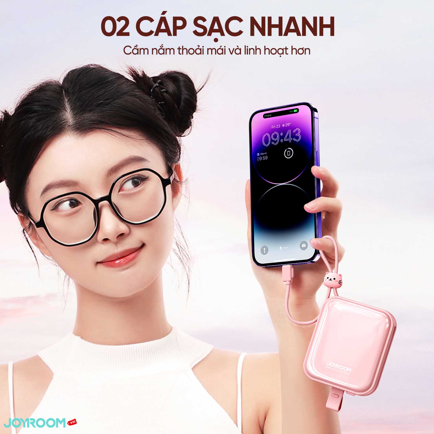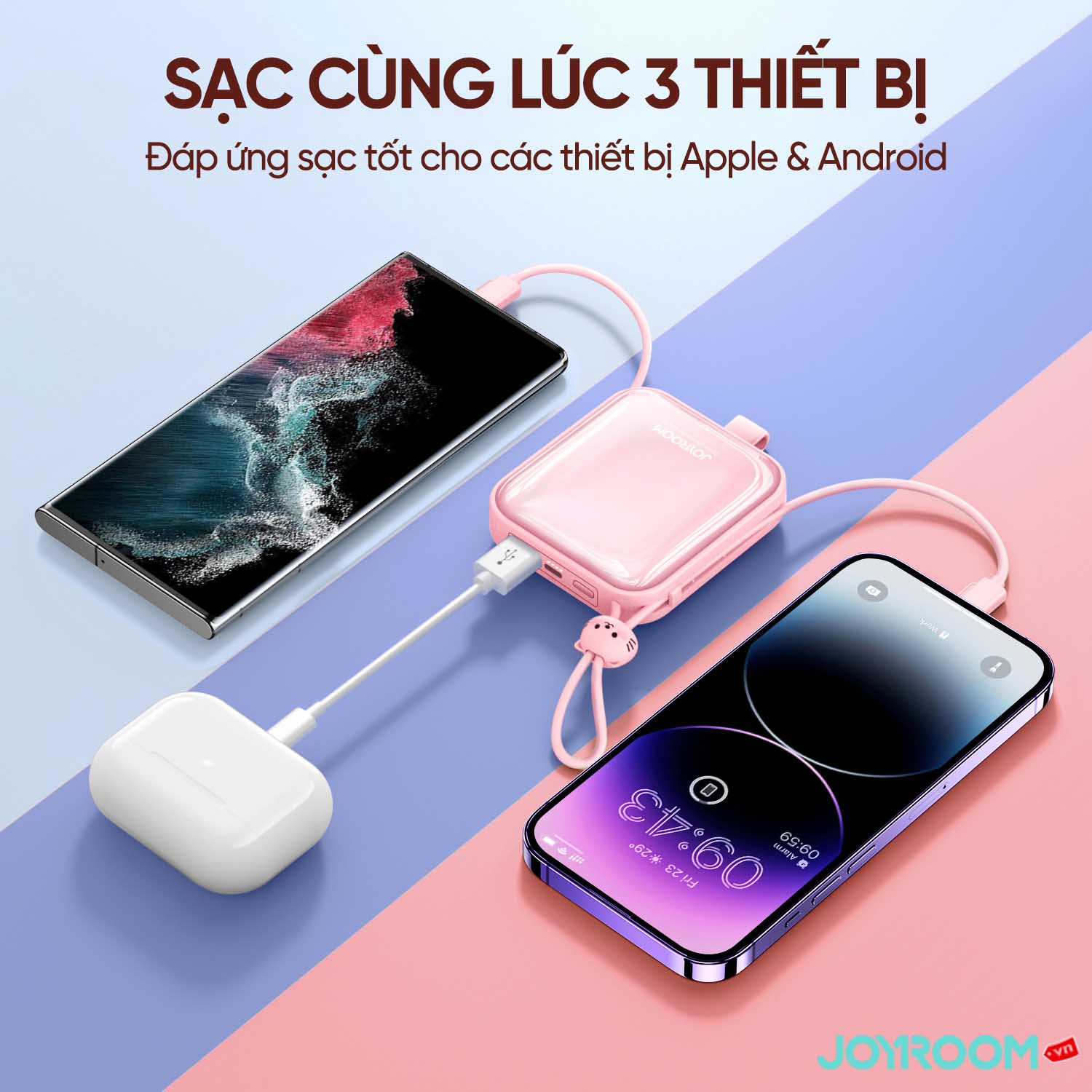 Với dung lượng pin 10000mAh, sản phẩm này có thể sạc được nhiều thiết bị trong một lần sạc. Ngoài ra, Joyroom Jelly Series 22.5W Power Bank tích hợp 2 dây sạc, bao gồm dây sạc USB-C và dây sạc Lightning (cho iPhone), giúp bạn tiện lợi khi sạc thiết bị của mình mà không cần mang theo nhiều dây cáp khác nhau