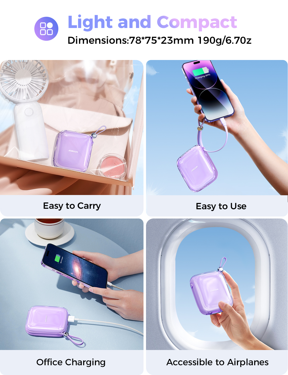 Thiết kế nhỏ gọn và nhẹ, Joyroom Jelly Series rất thuận tiện để mang theo bên mình trong các chuyến đi, dạo chơi hoặc làm việc hàng ngày. Bạn có thể dễ dàng cất nó trong túi xách, balo hoặc ngay trong túi quần của mình.