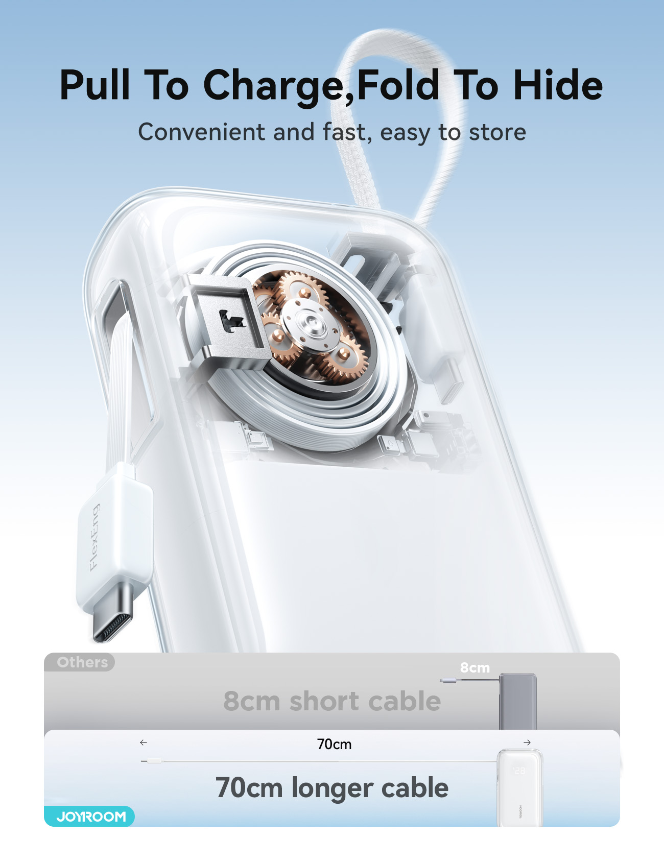 Thiết kế của Joyroom JR-PR2 giải quyết triệt để nỗi lo về dây sạc rườm rà. Sản phẩm là một sạc dự phòng mini dây rút đích thực với hai loại cáp tích hợp: