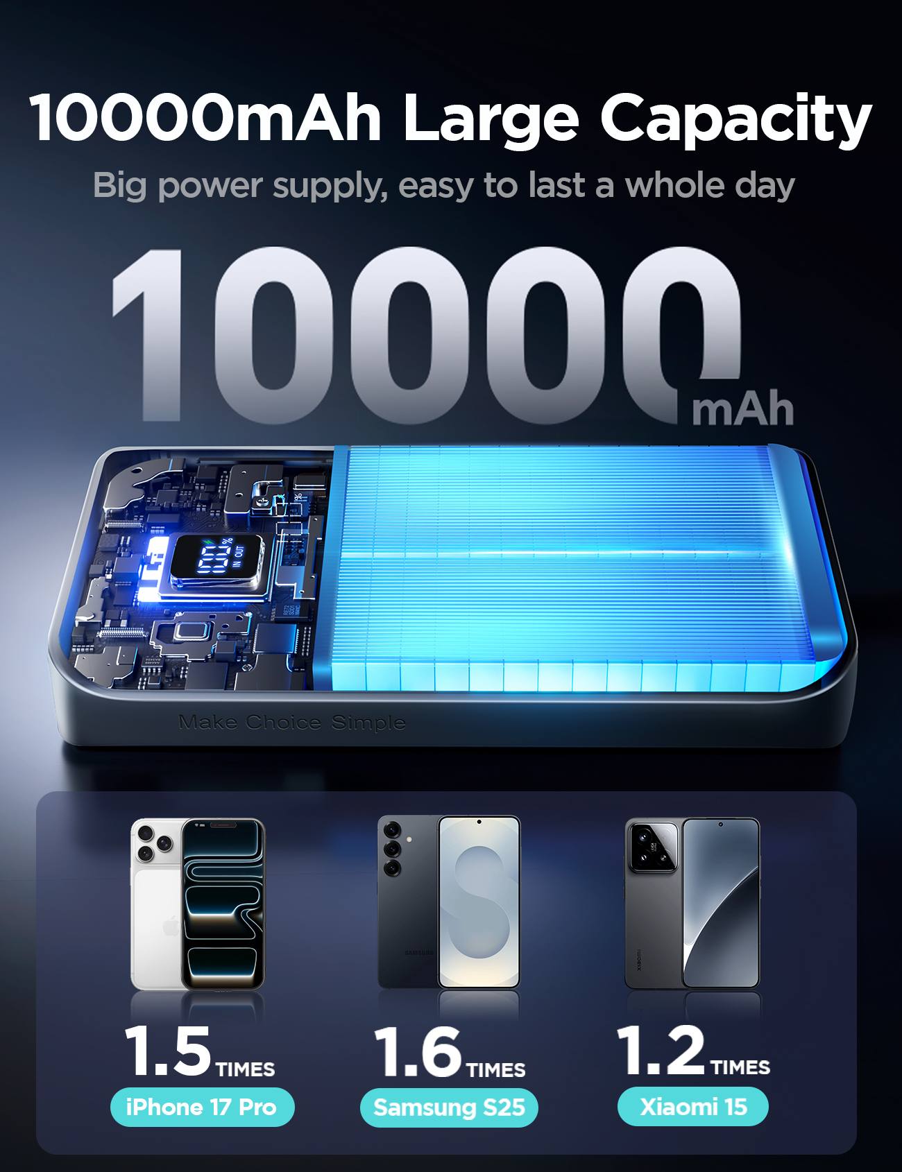 Pin sử dụng cell Li-ion dung lượng 10.000mAh 3.85V (38.5Wh), dung lượng định mức 5800mAh (5V⎓3.0A) giúp sạc được cho đa số smartphone hiện nay từ khoảng 1,5–2 lần tùy dung lượng pin máy. Mức dung lượng này là điểm cân bằng giữa thời lượng sử dụng đủ cho một ngày dài và kích thước – trọng lượng vẫn rất gọn nhẹ, không nặng tay như các pin 20.000mAh.