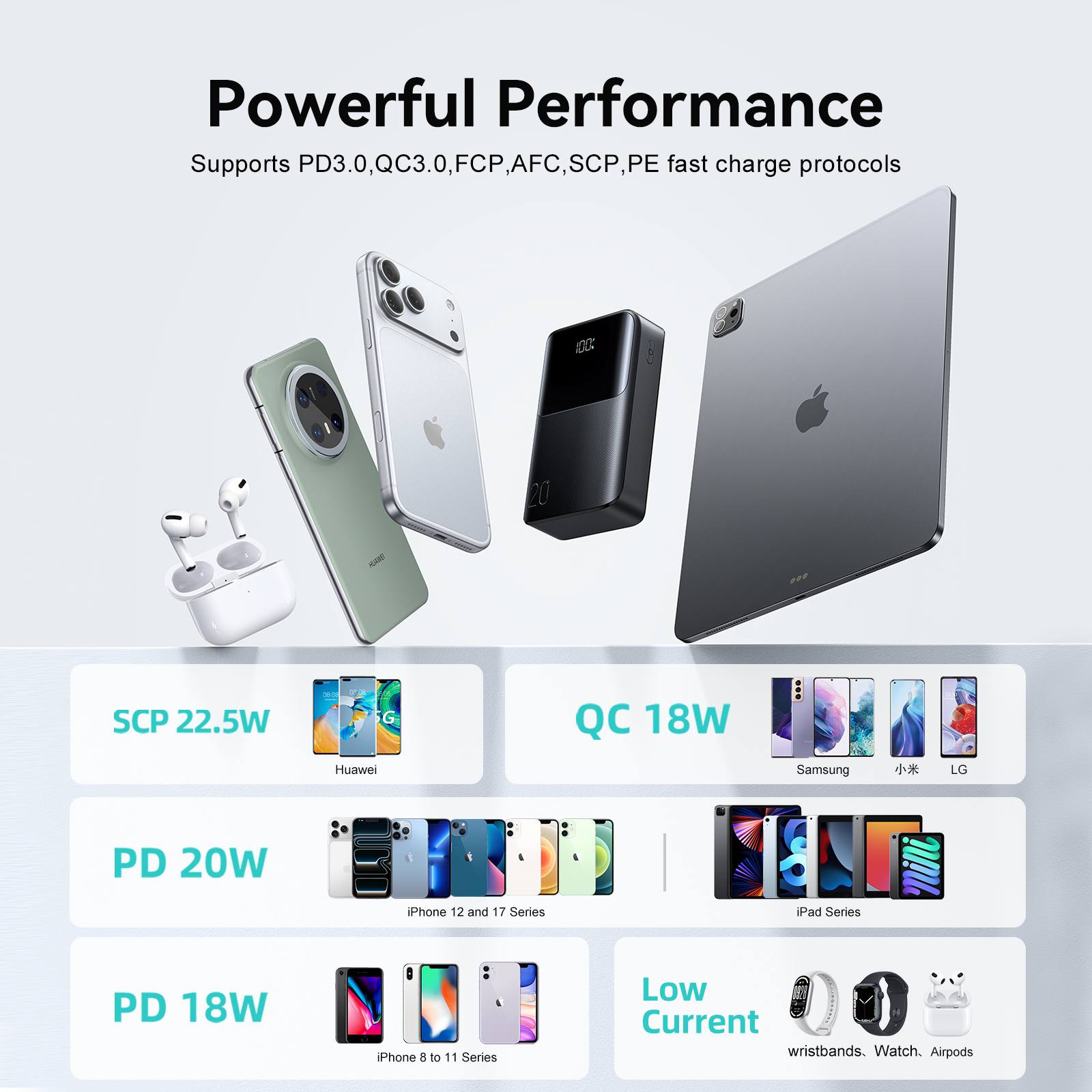 Joyroom QP192 hỗ trợ công suất tối đa 22.5W Super Fast Charging, tương thích với nhiều chuẩn sạc nhanh phổ biến như PD, QC, FCP, AFC… Công suất này cho phép: