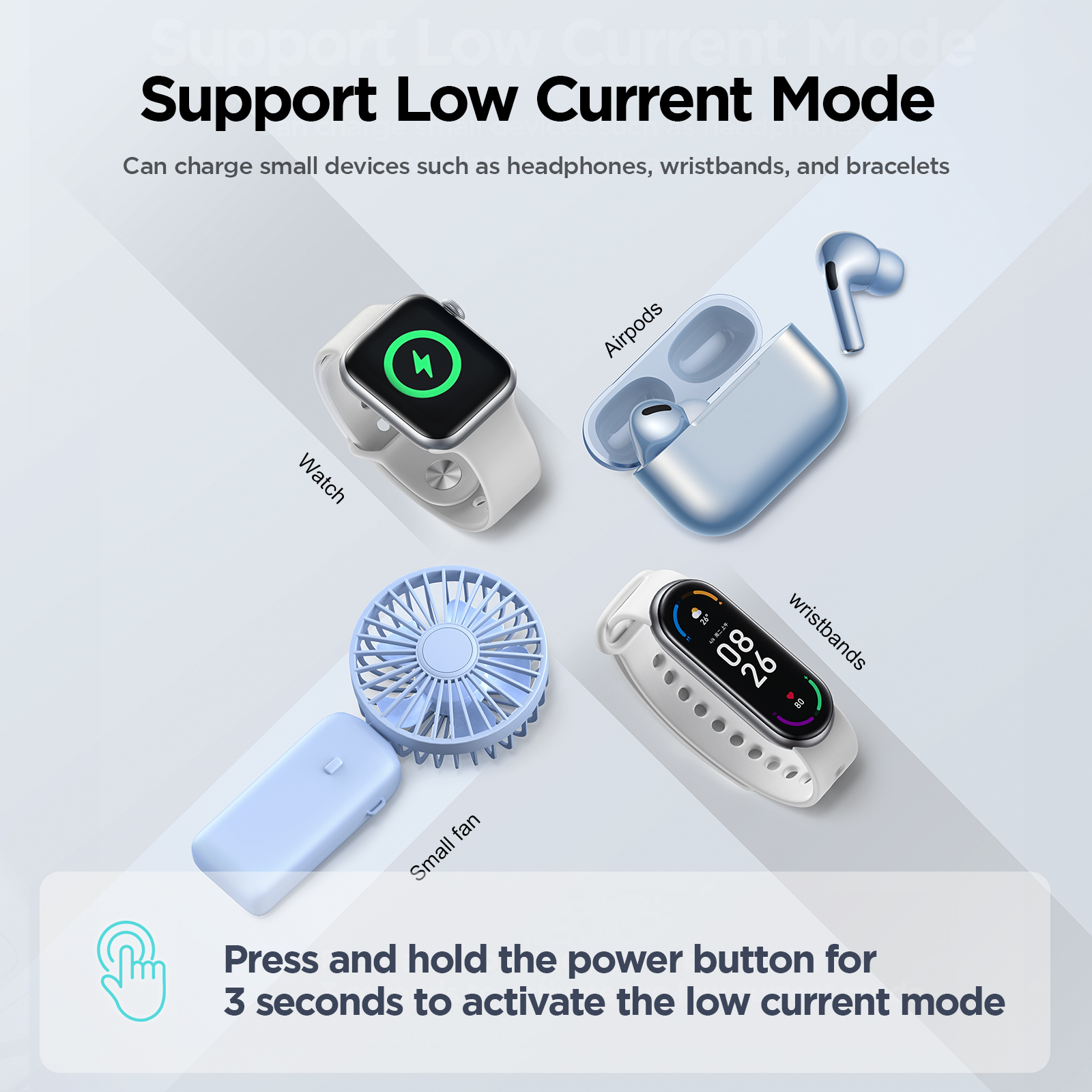 Một điểm cộng đáng chú ý: QP192 có low-current mode dành riêng cho các thiết bị yêu cầu dòng thấp như tai nghe Bluetooth, vòng tay thông minh, đồng hồ, bút cảm ứng… Chế độ này giúp dòng điện cung cấp ổn định, không làm quá tải hoặc gây hại cho những thiết bị nhỏ vốn không chịu được dòng sạc lớn.