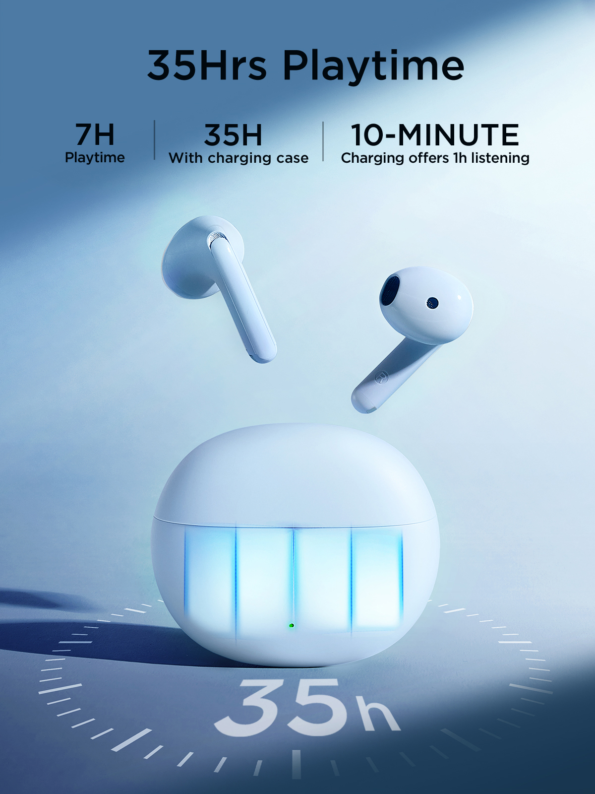 2. 35Hrs Playtime, ultra fast charging (7hrs Playtime on one charge, 35h total listening time with the charging case, 10-minute charging offers 1h listening time)