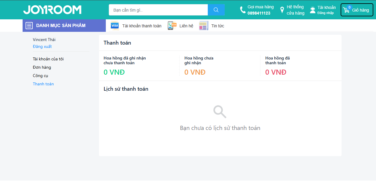 Ở trang thanh toán sẽ thấy Tổng hoa hồng chưa thanh toán - Hoa hồng ghi nhận - Hoa hồng đã thanh toán