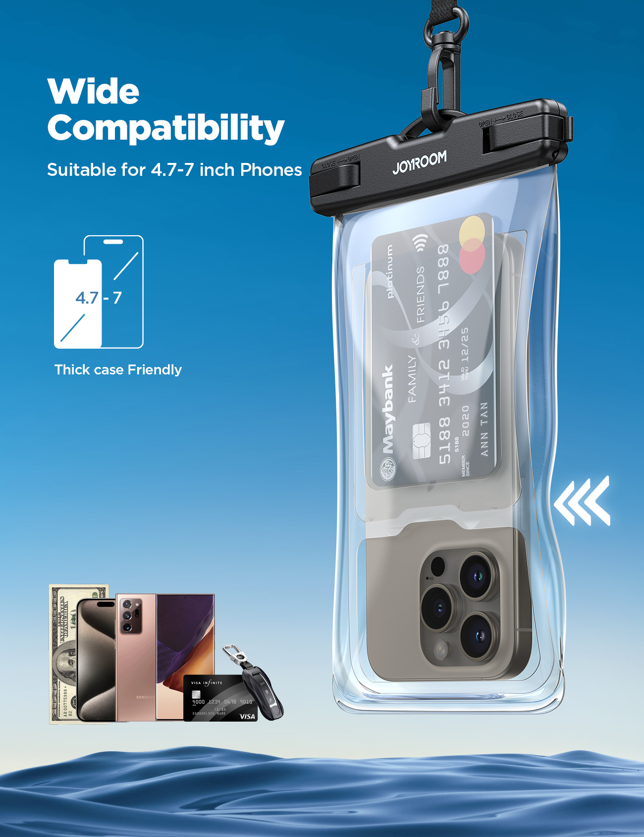 Trong những chuyến đi biển, cắm trại hay tham gia các hoạt động dưới nước, điện thoại luôn cần được bảo vệ tốt nhất khỏi nước, cát và bụi. Túi chống nước Joyroom ZS417 Waterproof là phụ kiện hoàn hảo giúp bạn vừa bảo vệ an toàn thiết bị, vừa thoải mái chụp ảnh, quay video, lướt mạng ngay cả trong môi trường ẩm ướt.