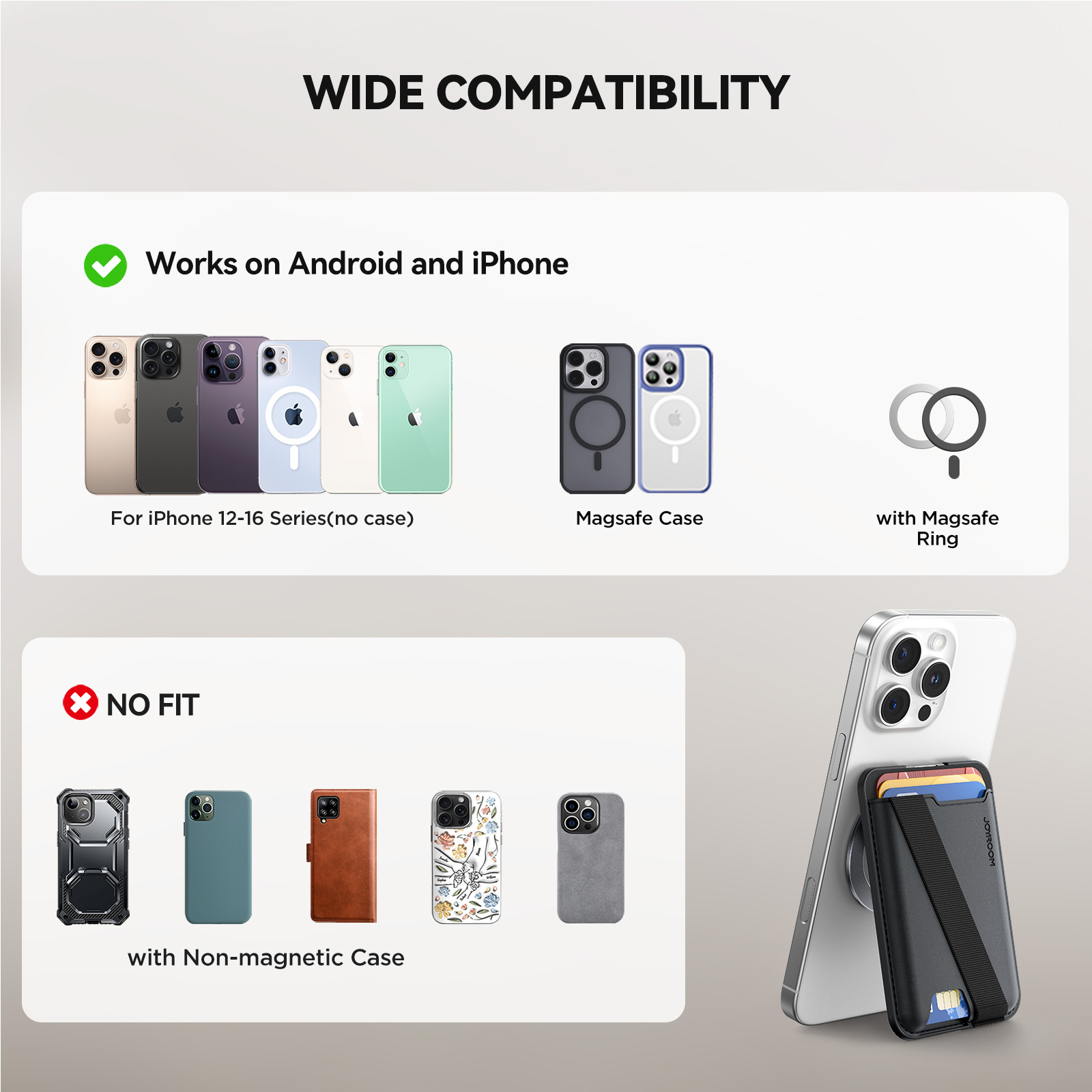 Không giống một số dòng ví MagSafe “chỉ” dành cho iPhone, Joyroom ZS432 MagSafe Wallet còn có thể sử dụng với Samsung, Xiaomi, OPPO nếu có ốp lưng kèm plate từ hoặc tích hợp module nam châm derrière. Tính linh hoạt này giúp người dùng dễ dàng thay đổi điện thoại trong tương lai mà không cần mua ví mới.
